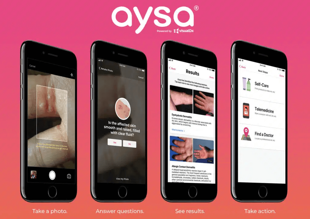 - Uses AI to identify visible skin symptoms (rash, bumps, etc.)