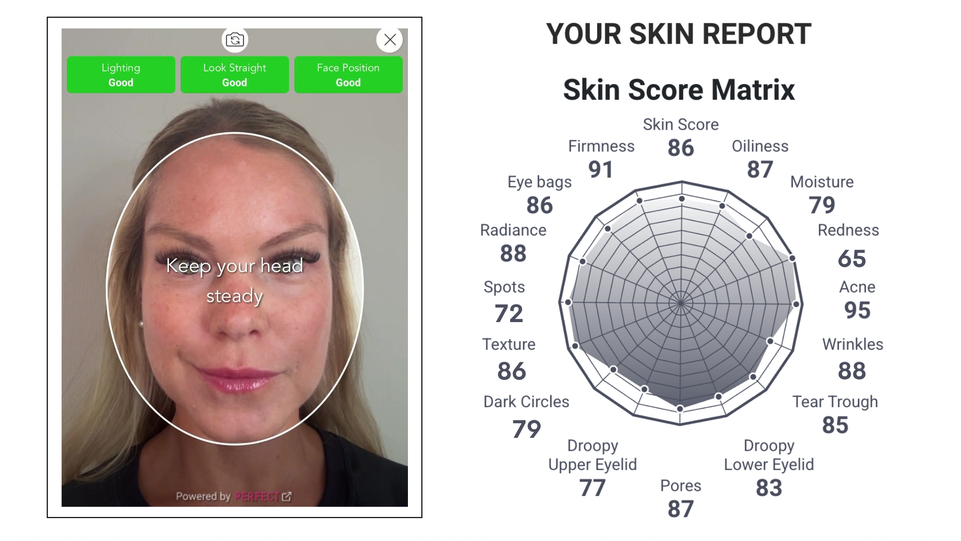 Open your camera to launch the AI Skin Analyzer . In just a few seconds, it evaluates your skin condition and generates detailed scores — including oiliness, hydration, pores, spots, fine lines, and more.