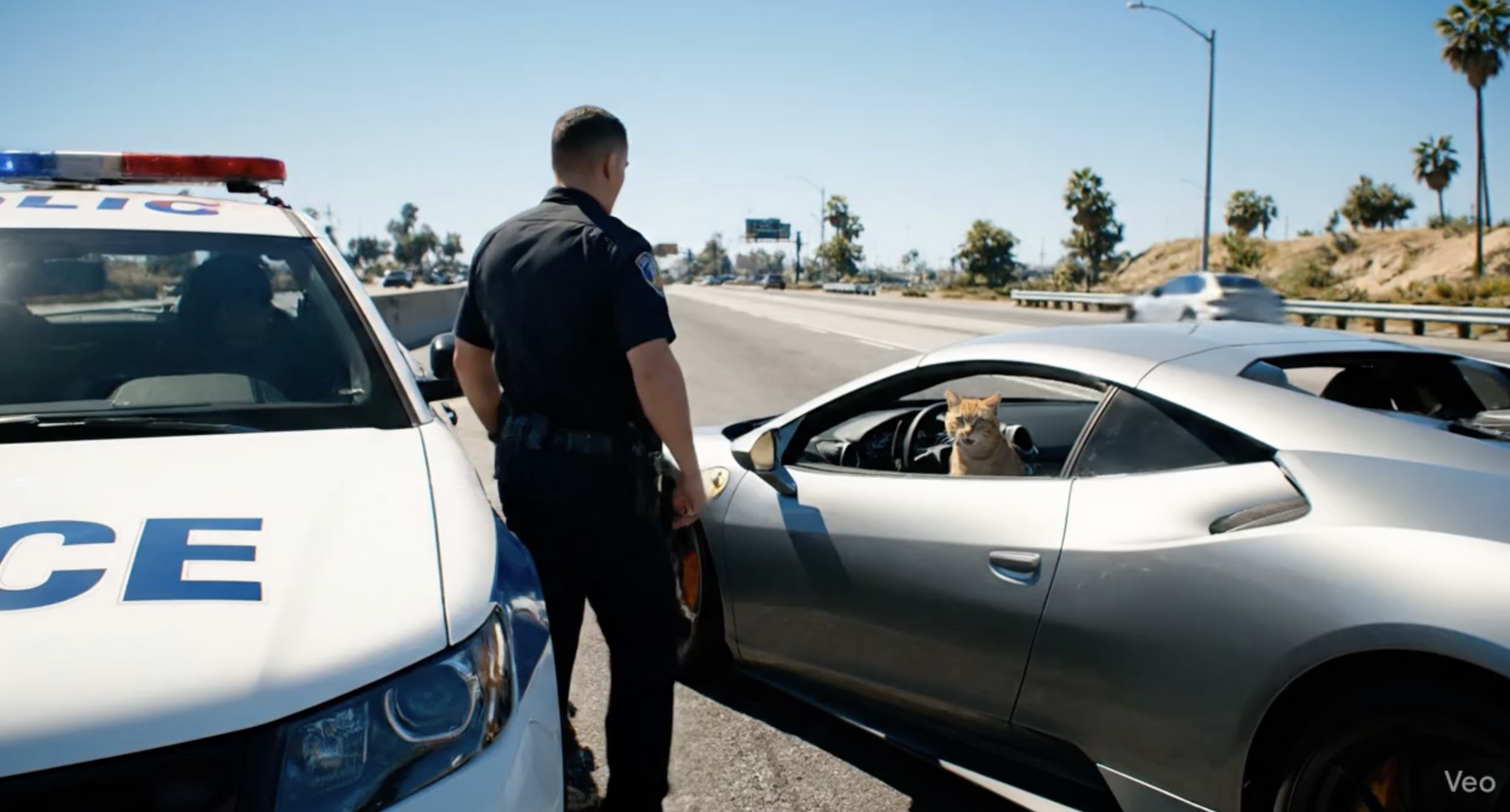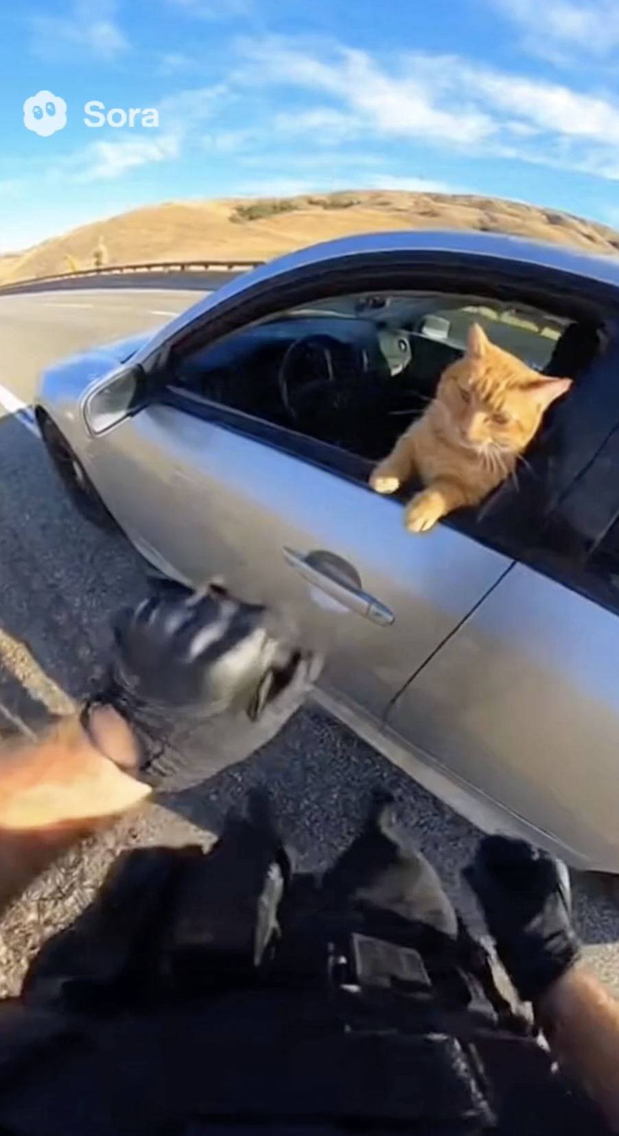 A realistic cinematic scene from the first-person view of a police officer during a traffic stop on a sunny California highway. The officer walks toward a luxury sports car driven by a mischievous orange tabby cat. The cat stares at the cop and lets out a loud hiss. Suddenly, the cat slams the accelerator, tires screeching, and speeds off onto the highway. The police officer starts running after the car on foot as the sirens blare in the background.