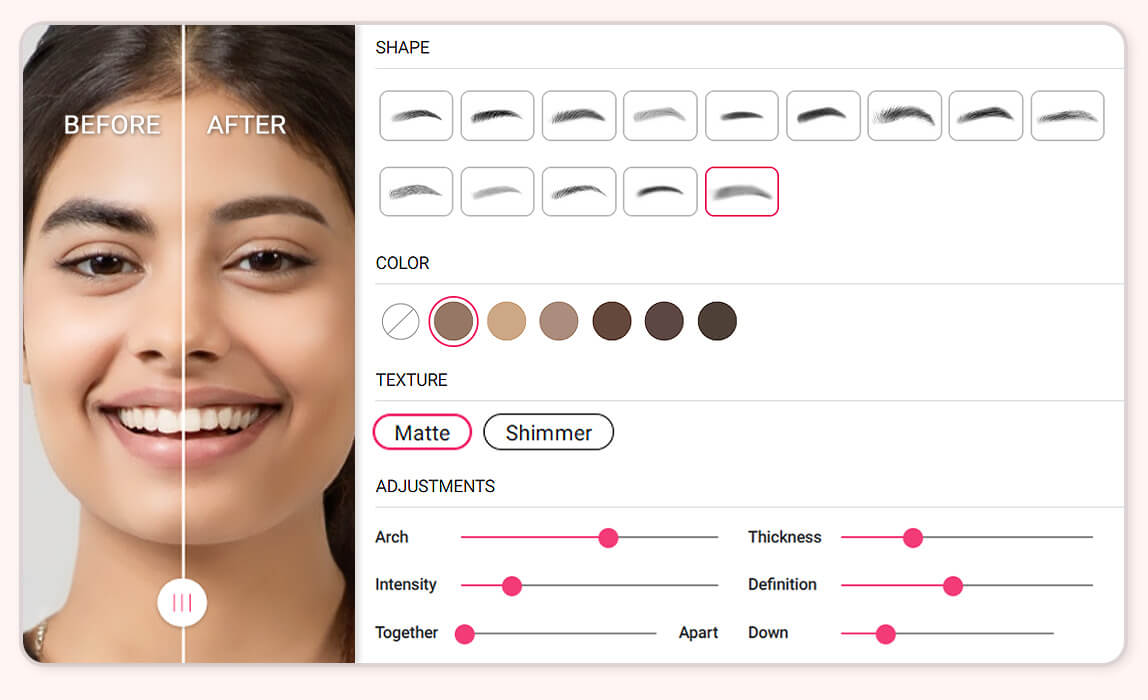 Color looks different depending on the formula. The Eyebrow Filter provides a "Texture" toggle (visible as Matte and Shimmer). This allows the AI to render the light reflection correctly—whether the product is a matte powder that absorbs light or a gel that adds a slight sheen—ensuring the virtual color behaves exactly like the physical product.