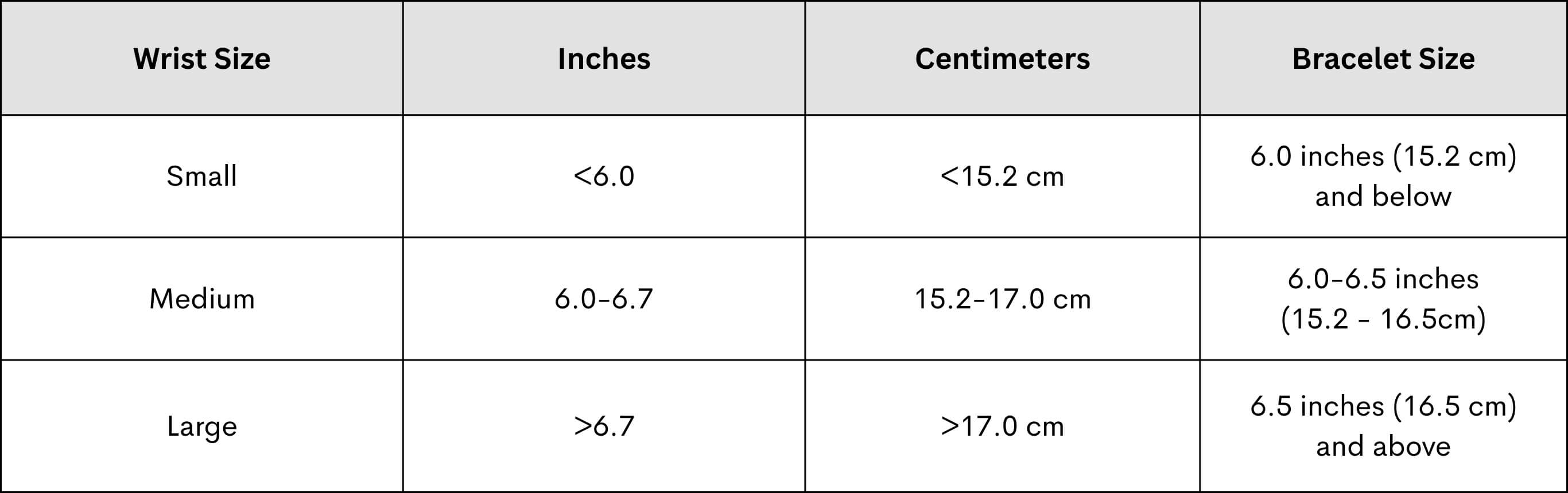 Note: Wrist size can differ based on body proportions and wrist shape.