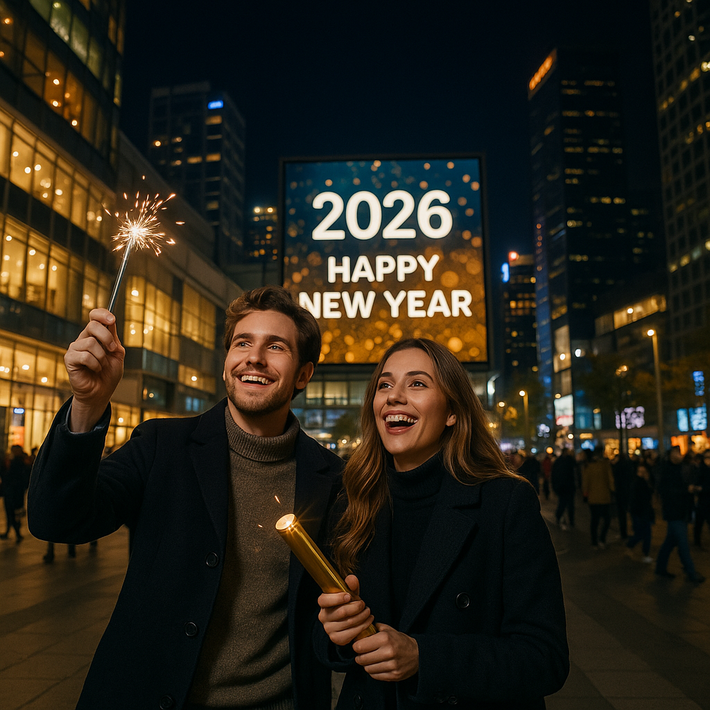Prompt: In a bustling, vibrant plaza at night, surrounded by shopping malls and skyscrapers, a New Year's countdown screen in the mall's outdoor area displays "Happy New Year 2026." A stylishly dressed white couple is counting down the New Year; the man holds fireworks, and the woman holds firecrackers.