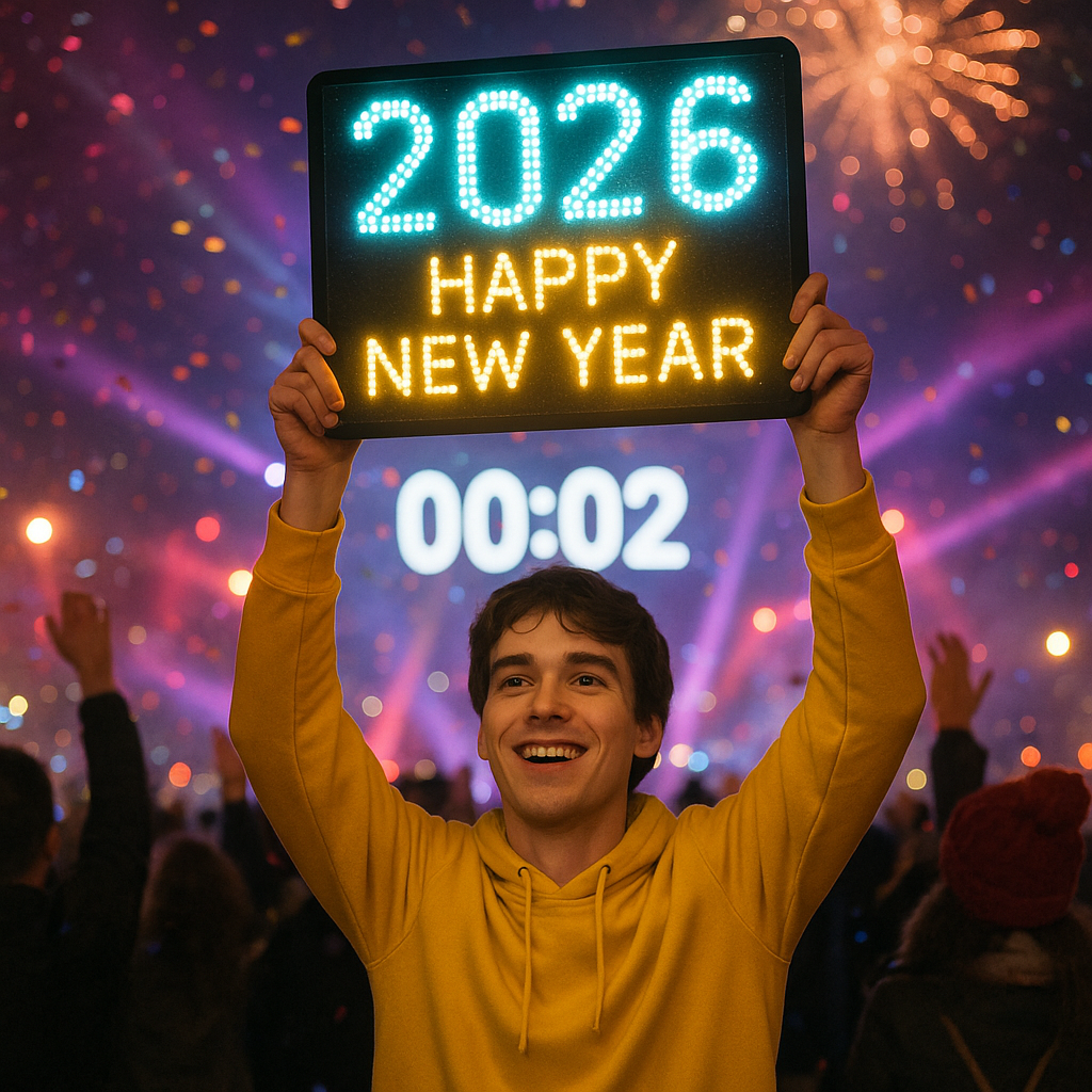Prompt: At the New Year's Eve event, a Caucasian man with brown hair, wearing a yellow hoodie, held up a light sign that read "2026 Happy New Year" in sync with the countdown.