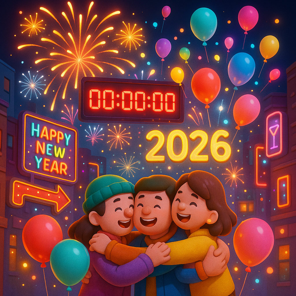 Prompt: A 3D cartoon-style New Year's Eve celebration unfolded, with the countdown screen flashing red "00:00:00". As soon as midnight struck, fireworks burst in the sky, illuminating the world. Cartoon characters embraced each other, their colorful balloons colliding and scattering sparks. Neon signs on the streets shimmered with colorful lights, and shouts of countdown mixed with glowing balloons rising into the air. The new year of "2026" began in dazzling splendor.