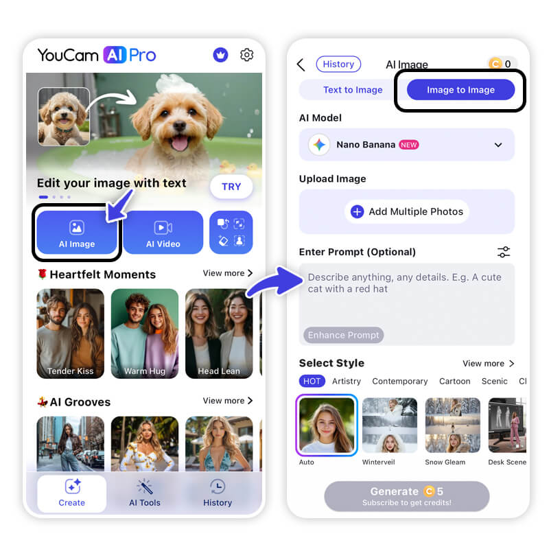 Navigate to AI Image section and use the YouCam AI Pro "Image-to-Image" tool.
