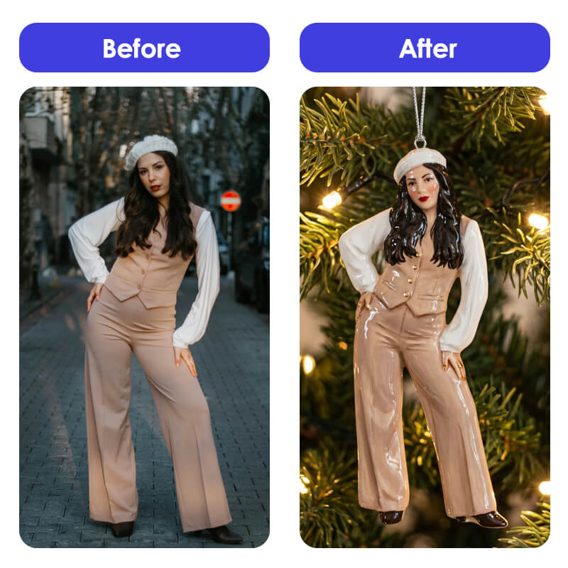 - Example Prompt: A beautiful, glossy Christmas tree ornament shaped as a woman that closely resembles the person in the provided photo. The ornament captures her hairstyle, facial features, and outfit, translating them into a festive, hand-painted figurine style. She is dressed in the same clothes as in the photo, with all accessories and signature details included. The ornament has a shiny, ceramic or glass-like surface, with subtle highlights, metallic accents, and hangs from a silver thread on an evergreen tree, surrounded by glowing Christmas lights, creating a cozy holiday atmosphere.