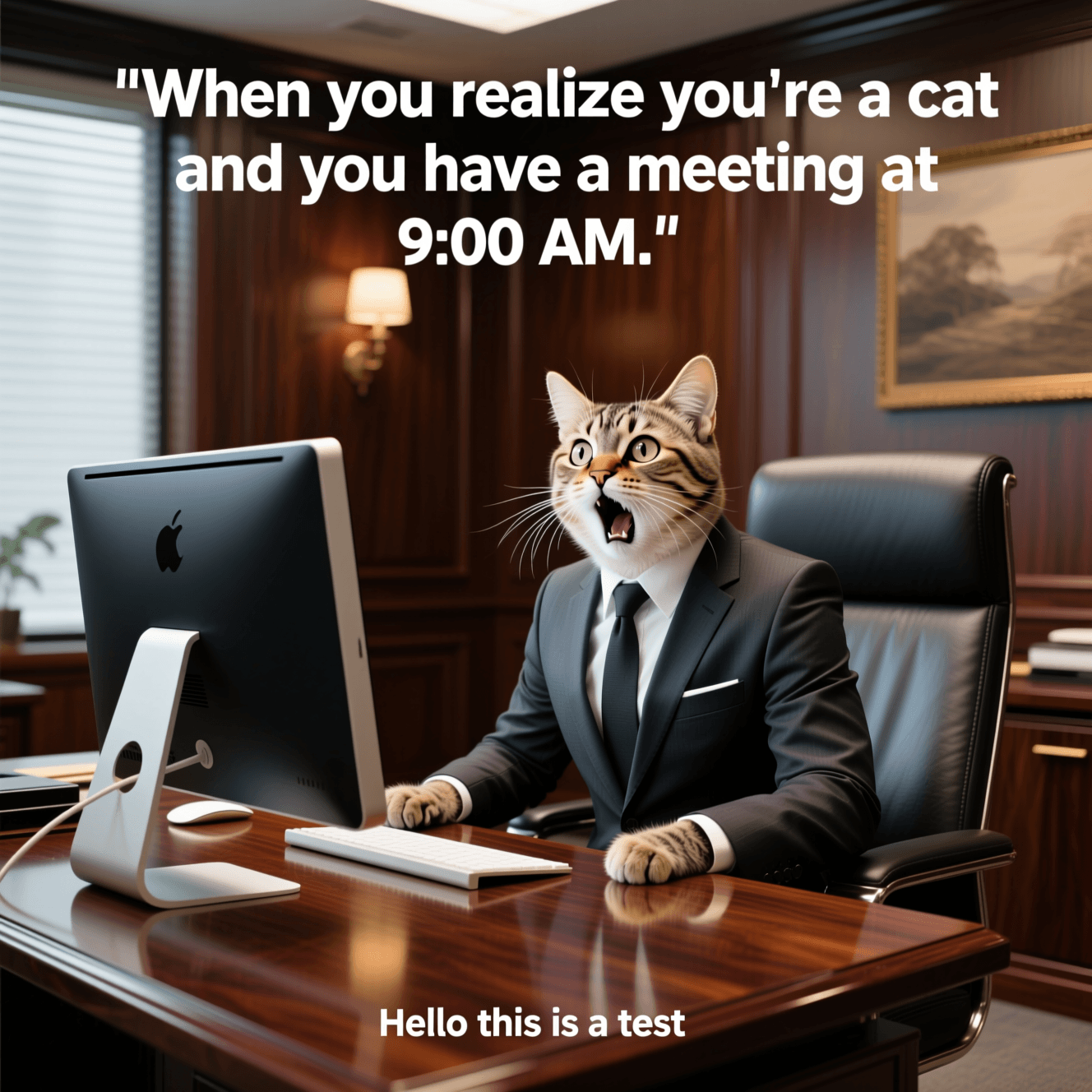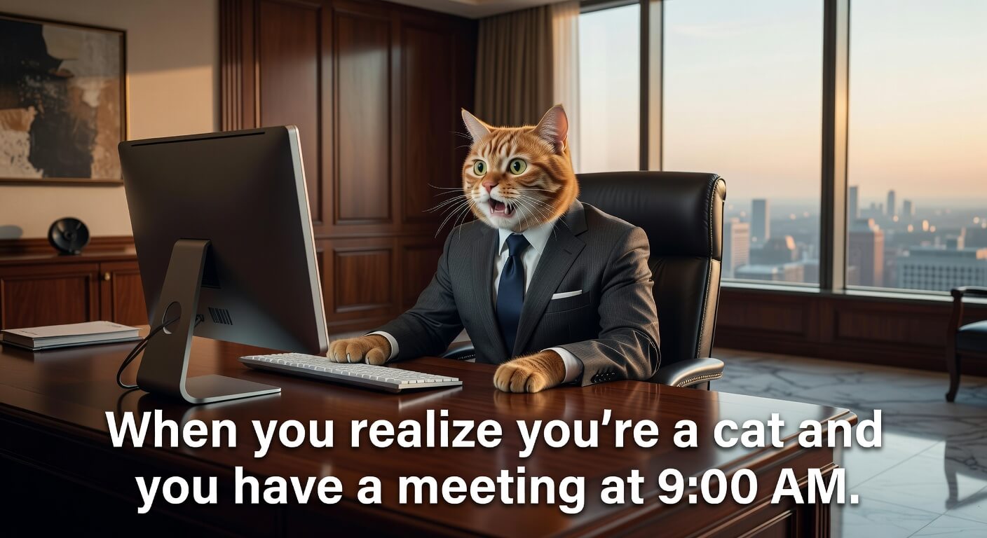- Prompt: A photorealistic cat wearing a sleek business suit, sitting at a mahogany desk in an upscale corner office, looking at a computer monitor with a look of extreme shock and horror. Text overlay concept: "When you realize you're a cat and you have a meeting at 9:00 AM." (Style: Photorealistic)