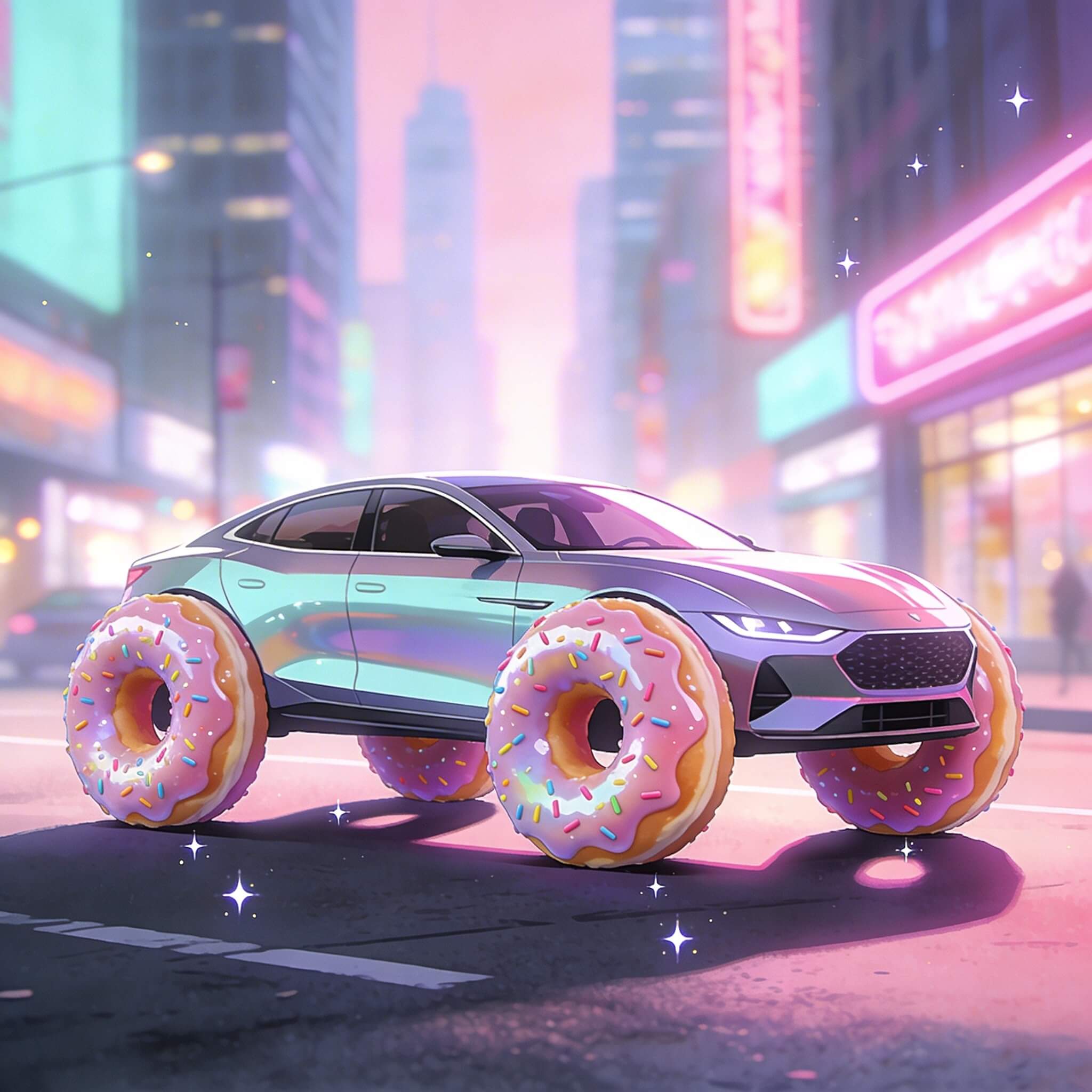 - Prompt: A surreal illustration of a modern car on a city street, where the four standard tires have been replaced by four giant, pastel-colored glazed donuts with sprinkles. (Style: Digital Illustration)
