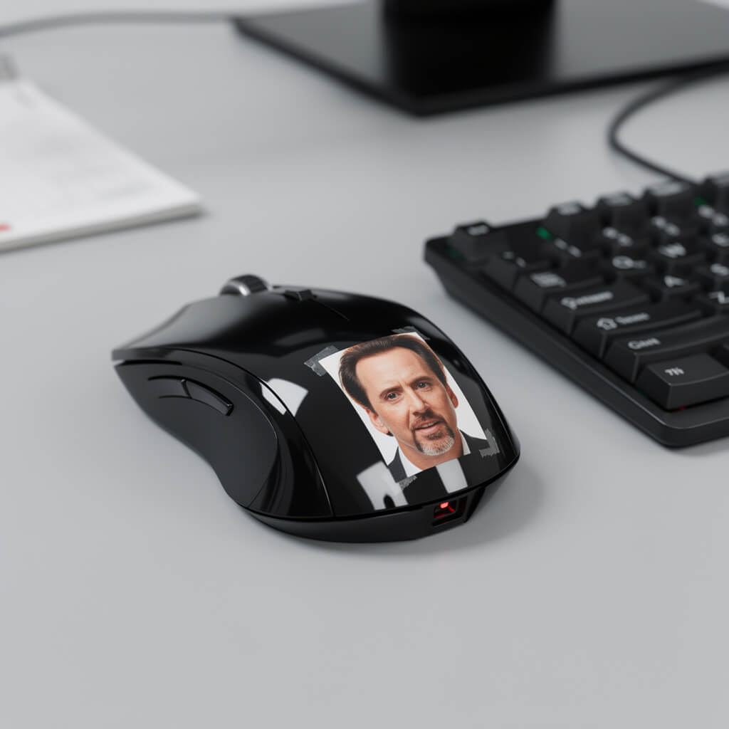 - Prompt: A classic office scene: a shiny, black ergonomic computer mouse is on a desk, next to a keyboard. A very small, detailed, photorealistic image of Nicolas Cage's face is taped directly over the red laser sensor on the bottom of the mouse. (Style: Product Shot)