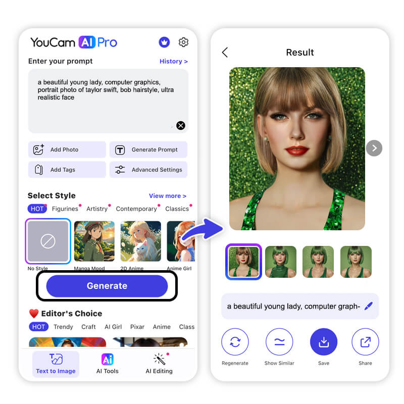 If you're looking for a free AI image generator app to generate images from text, try YouCam AI Pro. This top-tier AI graphic generator app offers both text-to-image and image-to-image tools, perfect for generating AI Images. It can effortlessly turn your photos into stunning AI images or create entirely new images based on your text prompts.