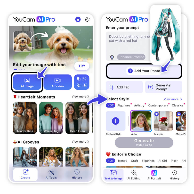 Turn your photos into dynamic videos with YouCam AI Pro! Upload a photo, choose an animation style, and let the AI add realistic movements and effects. Perfect for creating captivating content from your AI-generated images!