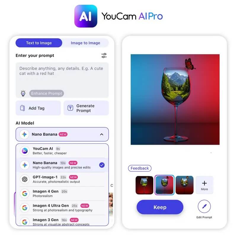 YouCam AI Pro now supports a full suite of cutting‑edge AI models — from high‑fidelity image engines to cinematic video generators — giving you total creative flexibility. Users can switch easily between leading models such as GPT‑Image‑1, Nano Banana Pro, Sora2, Imagen 4, Flux 1.1 Pro / Flux 1 Kontext, or the app’s native engine, depending on your creative goal.