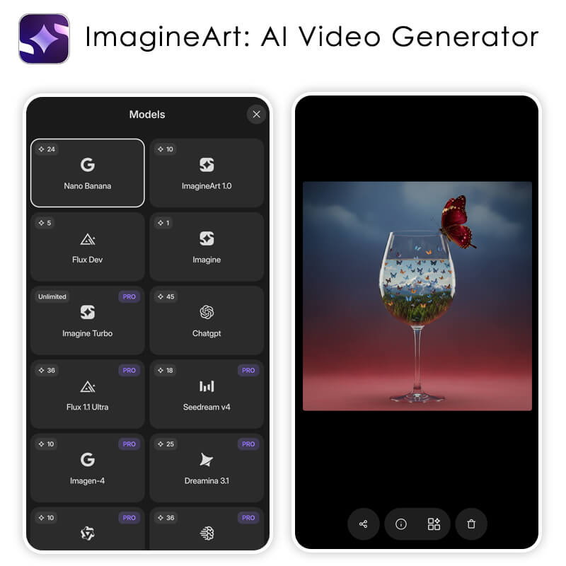 Imagine Art offers Flux, Flux Dev, Imagen 3, ImagineArt 1.0, Kling (Video), Hailuo (Video), Imagine You.