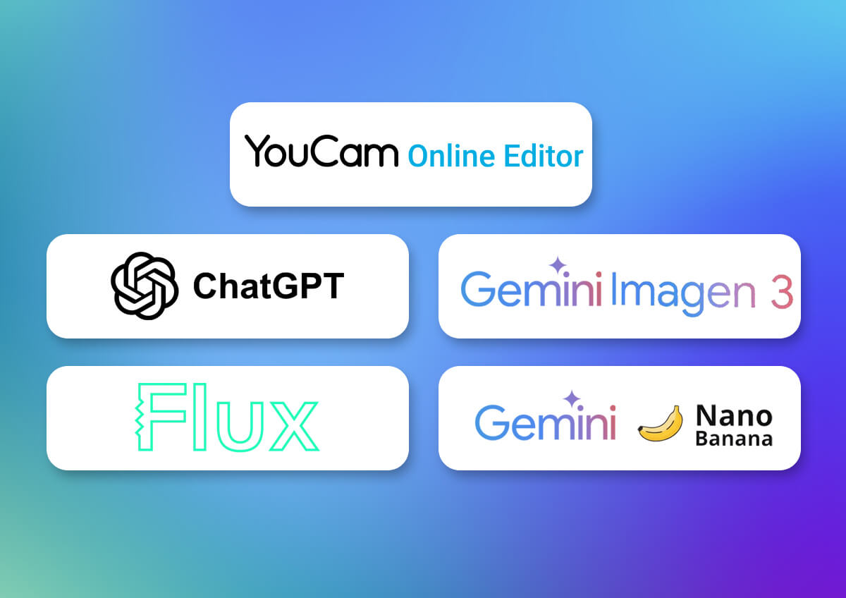 YouCam AI, GPT-4o, Nano Banana, Imagen 4 Ultra, Image 4, Flux 1.1 Pro Ultra, Flux 1.1 Pro, Flux.1 Pro, Flux.1 Kontext Pro, and Flux.1 Kontext Max.