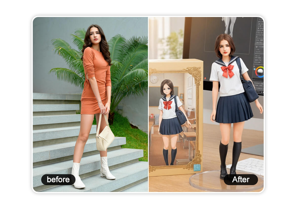 Remix uploads to reinvent it with new styles, creating unique visuals effortlessly. Supporting YouCam AI, GPT-4o, Nano Banana, Flux.1 Kontext Pro, and Flux.1 Kontext Max – perfect for style swaps or enhancements.