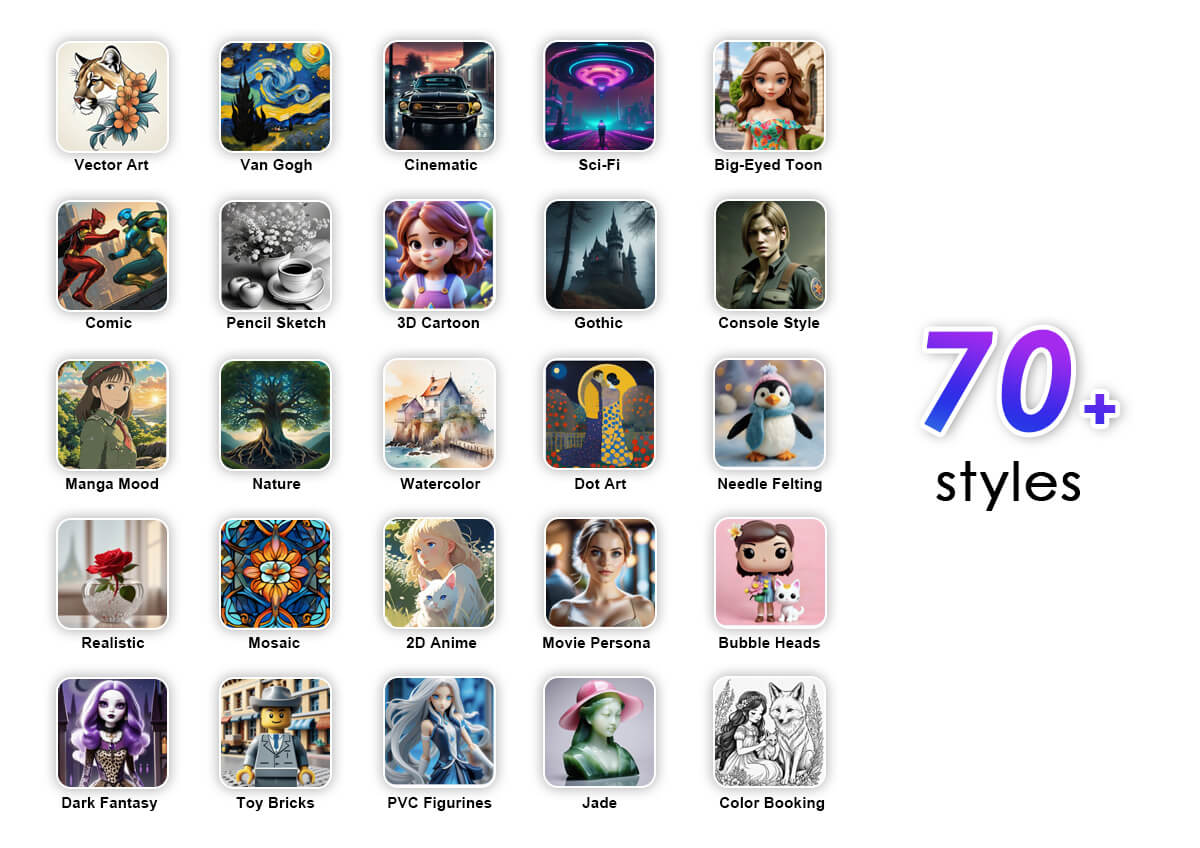 With 70+ built-in art styles—ranging from cinematic, painterly, anime, sci-fi, to Japanese animation. It is also strong for pro headshots, pet avatars, and 3D figures.