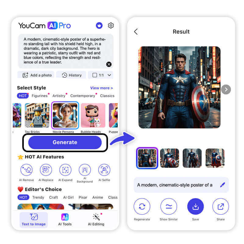 With YouCam AI Pro, you can create your own Captain America-inspired poster with text-to-image AI.