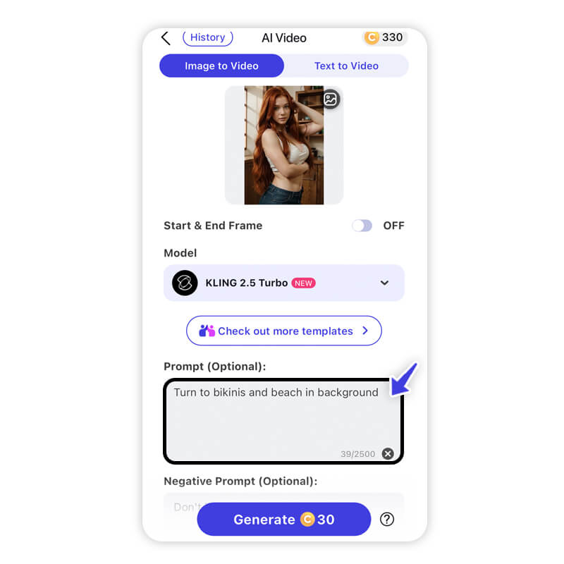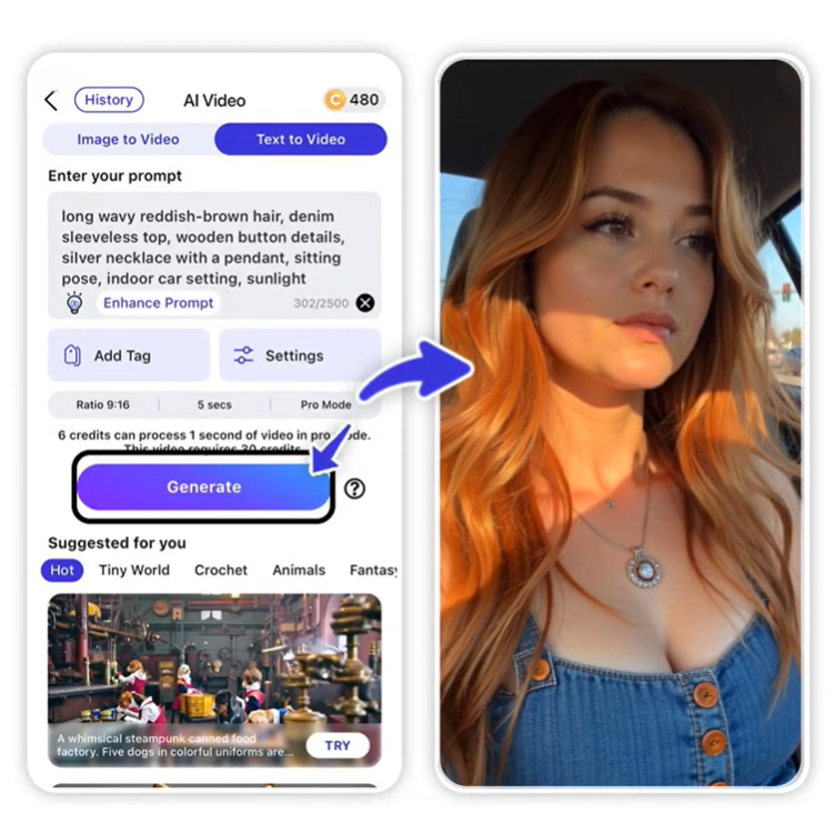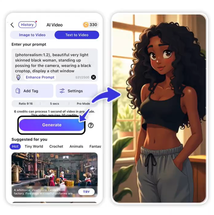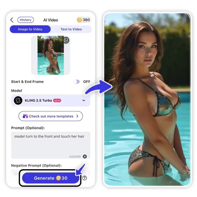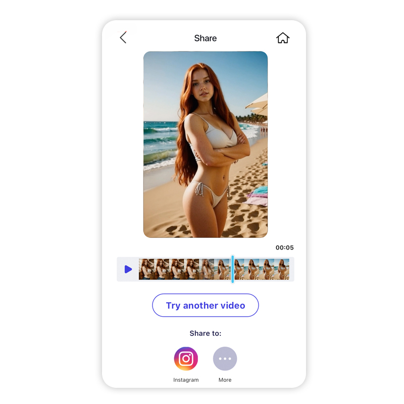 Tap "Generate" —wait 5-15 seconds → Preview your steamy masterpiece! Hit Save to camera roll or Share direct to TikTok/IG.