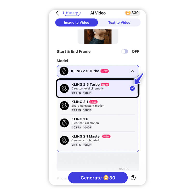 This is the multi-model magic! Tap the dropdown to choose from elite options: Google Veo 3 for cinematic realism, Kling 2.1 for dynamic action, Vidu 2.0 for detailed scenes, Hailuo 02 for artistic flair, or PixVerse 5 for quick loops. Match the model to your NSFW vibe—e.g., Veo 3 for sultry slow-mos.