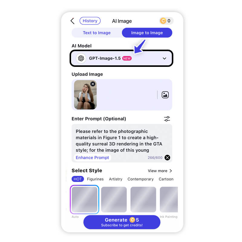 Choose an AI model like YouCam AI , GPT-Image-1.5 and more.