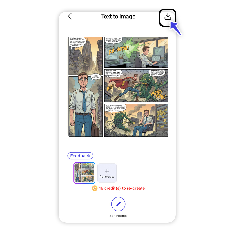 Use the AI's editing tools to tweak the lighting or add speech bubble spaces, then export your high-resolution masterpiece!