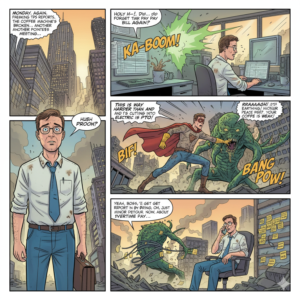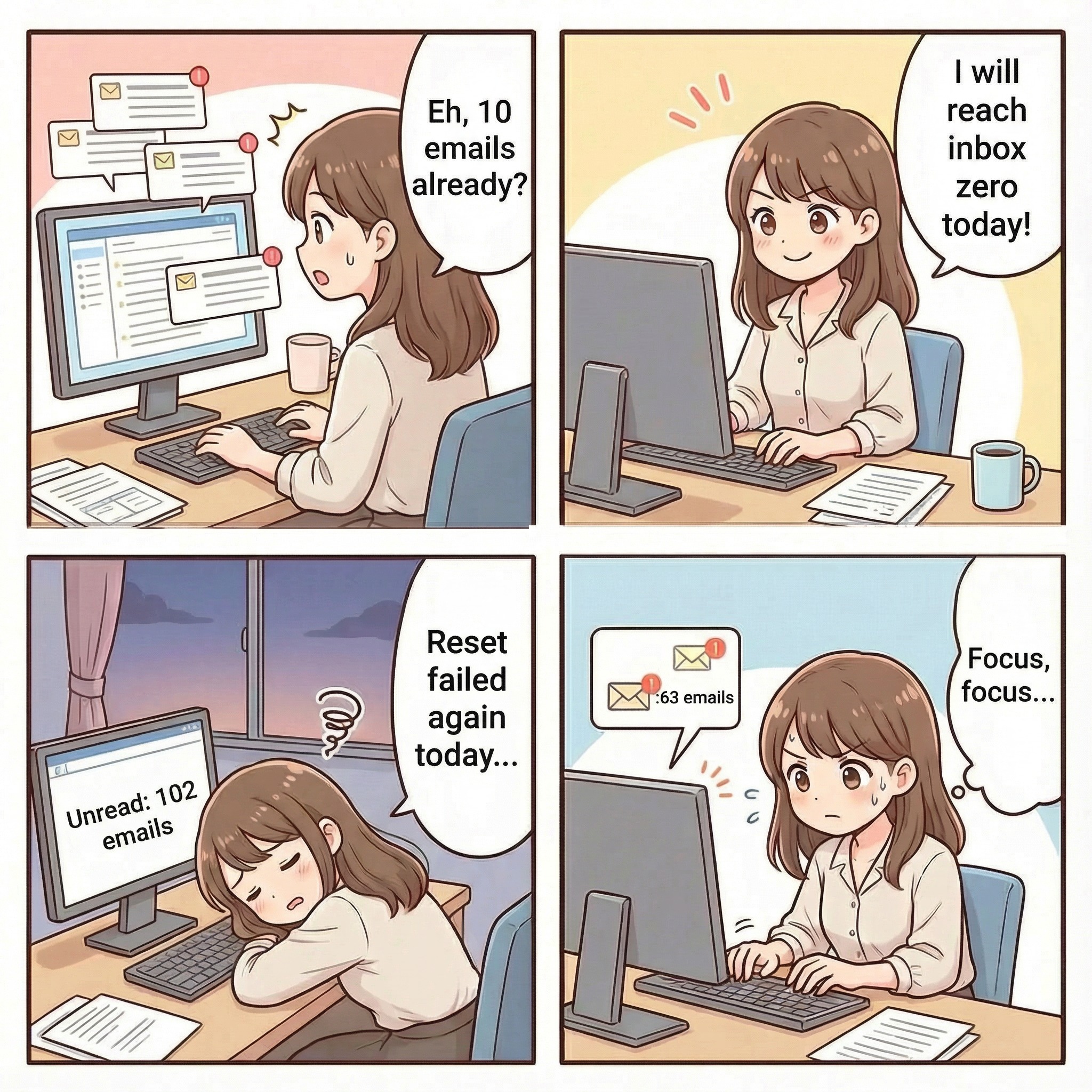 - Panel 1: Heroine at desk, determined. Speech bubble: "Inbox Zero is the goal today!"
