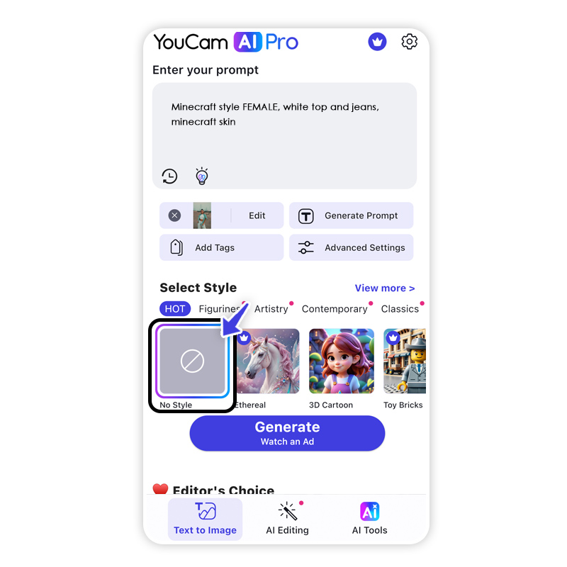 This is where the magic happens. Scroll through the art styles and select the No Style. With its pixelated textures and clean lines, it captures Minecraft’s iconic blocky look.