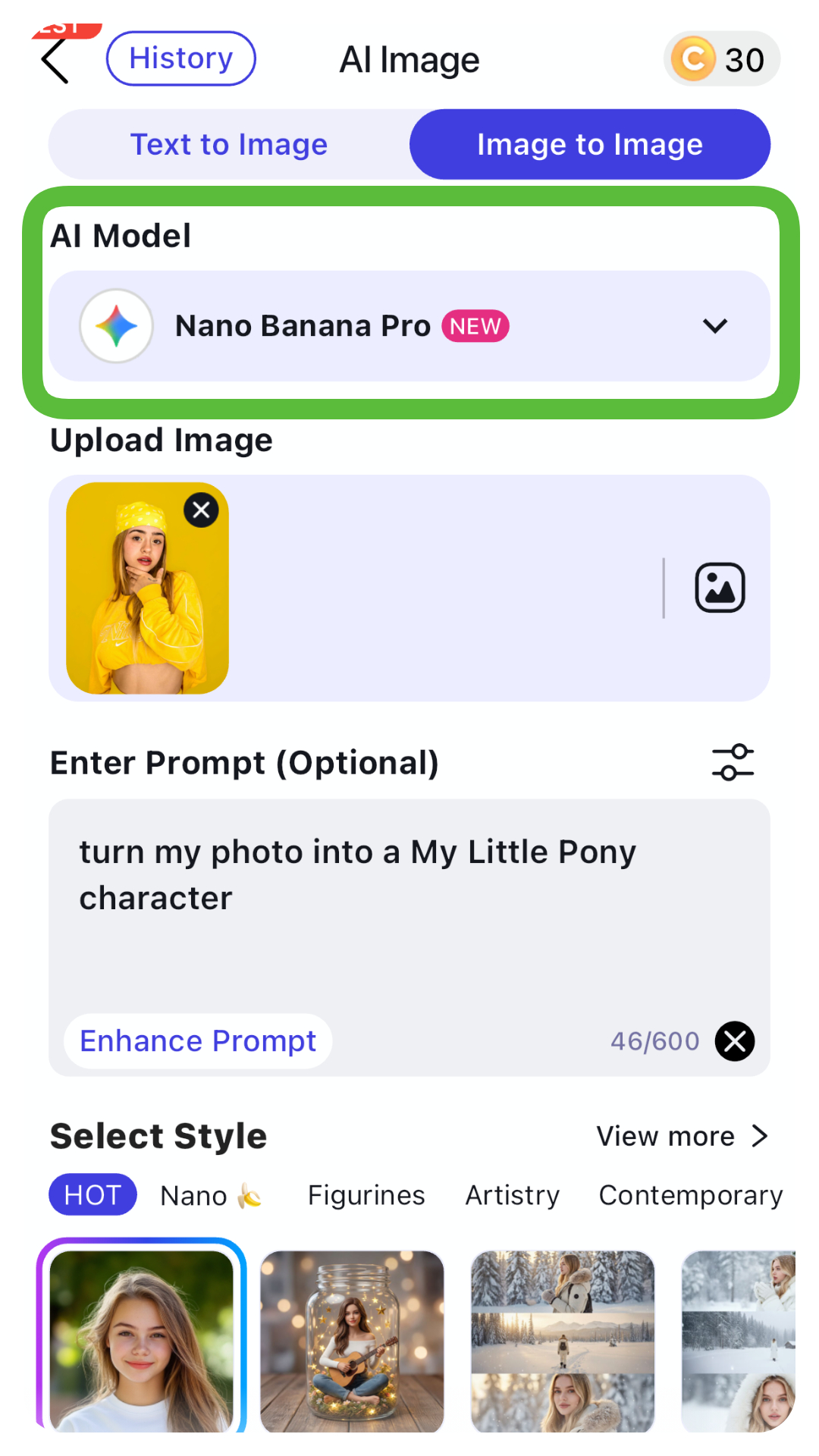 Open the app and select the "Image to Image" option. This is the key to making the pony look like you.