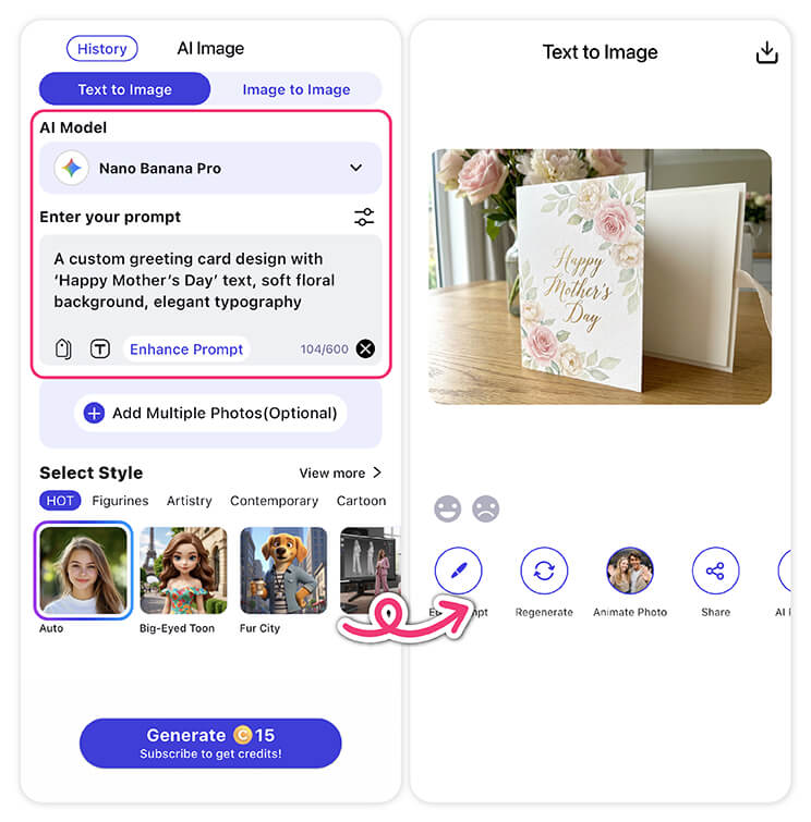 The easiest way is to use YouCam AI Pro’s Text to Image feature. Simply download the app, choose the feature, and paste one of the prompts. The AI generates an image instantly, which you can then save or share. It’s fast, beginner-friendly, and doesn’t require any design experience, making it perfect for creating a meaningful Mother’s Day gift.