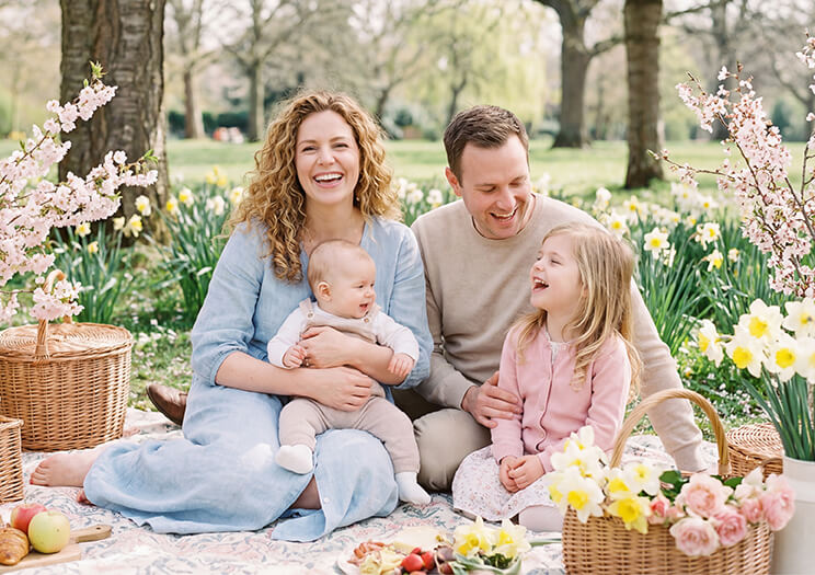 3. “A family picnic in a park with a smiling mother at the center, spring flowers in bloom, soft pastel tones, lifestyle photography”