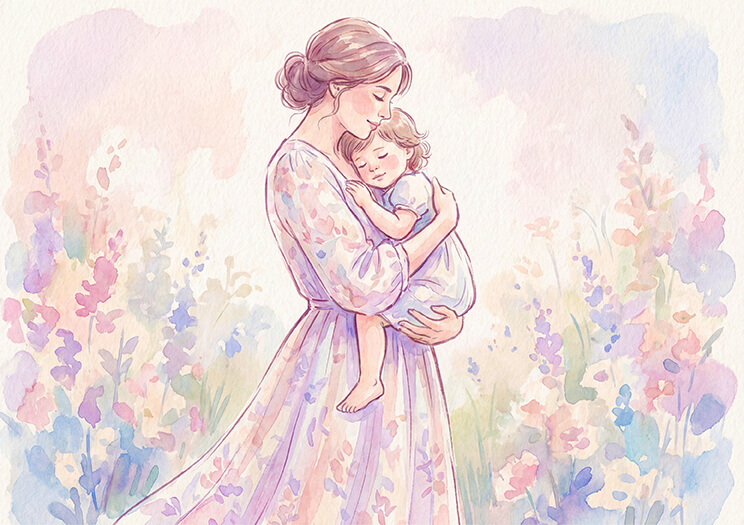 12. “Watercolor-style illustration of a mother holding her child, soft brush strokes, light pink and lavender tones”
