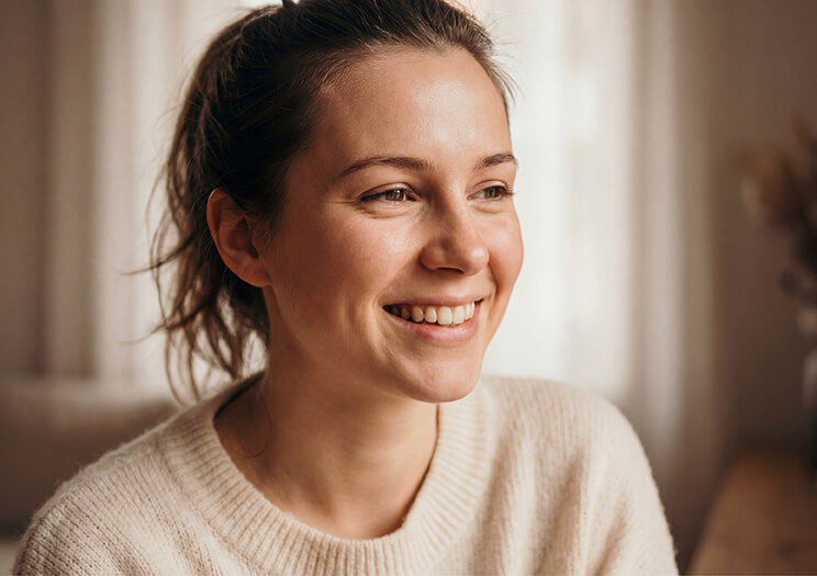 8. “Close-up portrait of a smiling mother with glowing skin, soft lighting, beauty photography style”