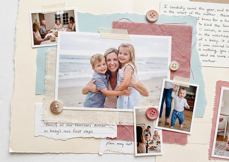29. “A scrapbook-style collage featuring a mother and family moments, layered textures, soft colors”