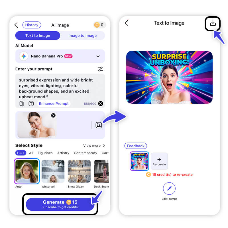 Creating a powerful YouTube thumbnail doesn’t require expert design skills. With YouCam AI Pro and its built-in Nano Banana Pro engine, you can generate eye-catching visuals, highlight emotions, create transformations, and experiment with trends using simple prompts.