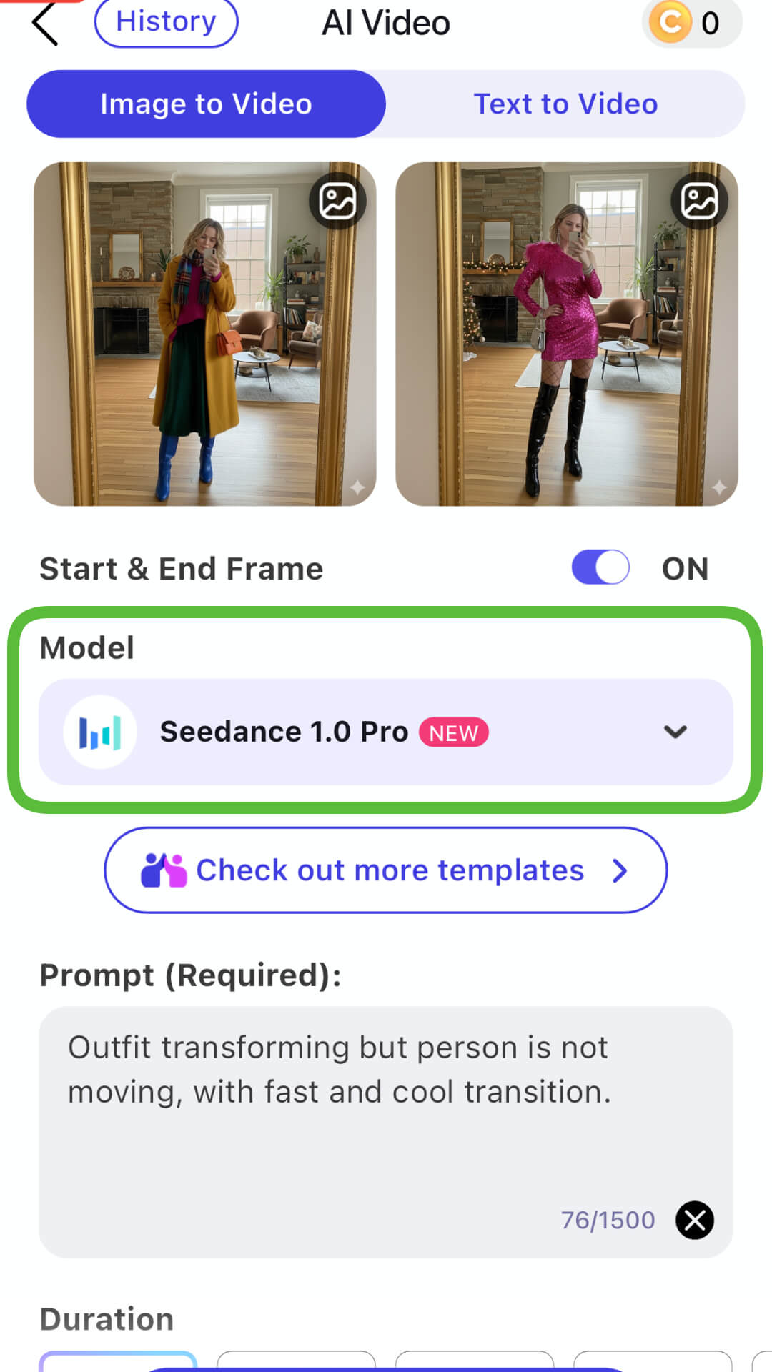 To ensure the smoothest, most high-definition morph, select the recommended Seedance 1.0 Pro model. It's optimized for creating fluid, dynamic videos from still images.