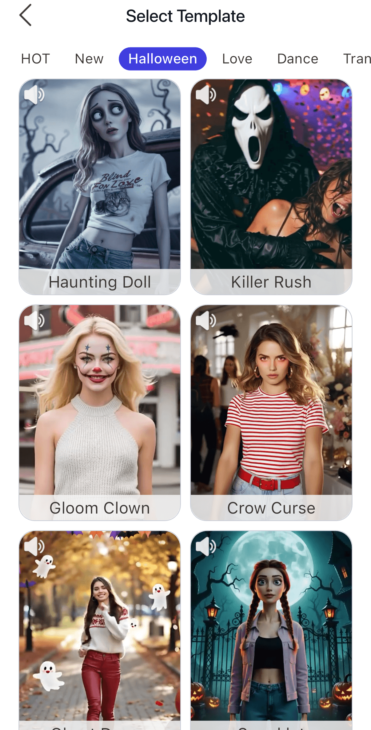 Browse through the available video templates and select one of the "Halloween" styles. We suggest using "Haunting Doll" & "Spooklet" for best results. These are specifically designed to give you that iconic Burton-esque look.