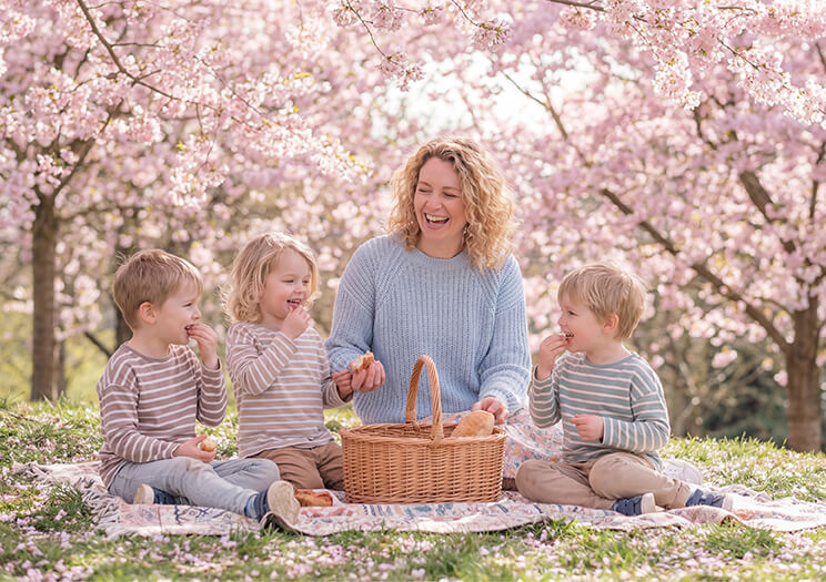 11. Picnic with mom and children under cherry blossom trees, pastel tones, photorealistic, happy moments