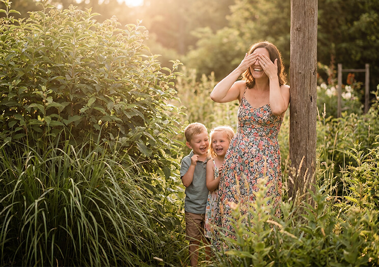 27. Mom and kids playing hide-and-seek in the garden, soft sunlight, candid joyful moment, photorealistic
