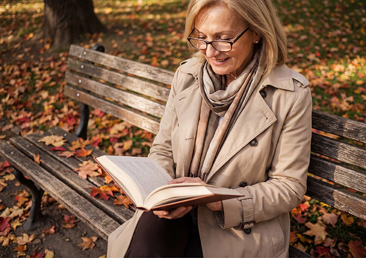 3. Elegant mom sitting on a bench in a park, reading a book, autumn leaves around, soft shadows, high detail portrait