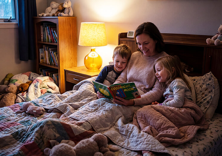 49. Mom reading bedtime story to children, soft warm bedroom light, realistic and heartwarming atmosphere