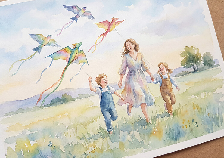 35. Whimsical watercolor of mom and children flying kites in an open field, soft lighting, heartwarming scene