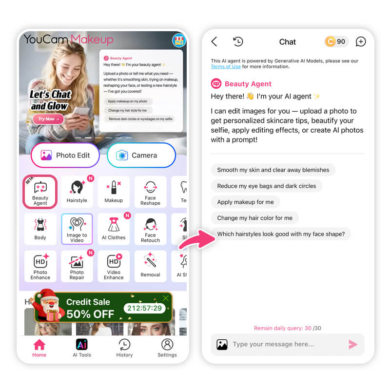 Stop wasting time and money on makeup that might not work! We have the ultimate secret weapon for your Christmas transformation: the YouCam Makeup app. This isn't just a filter; it's a cutting-edge AI Agent that guides you to your perfect look and lets you try it on instantly.