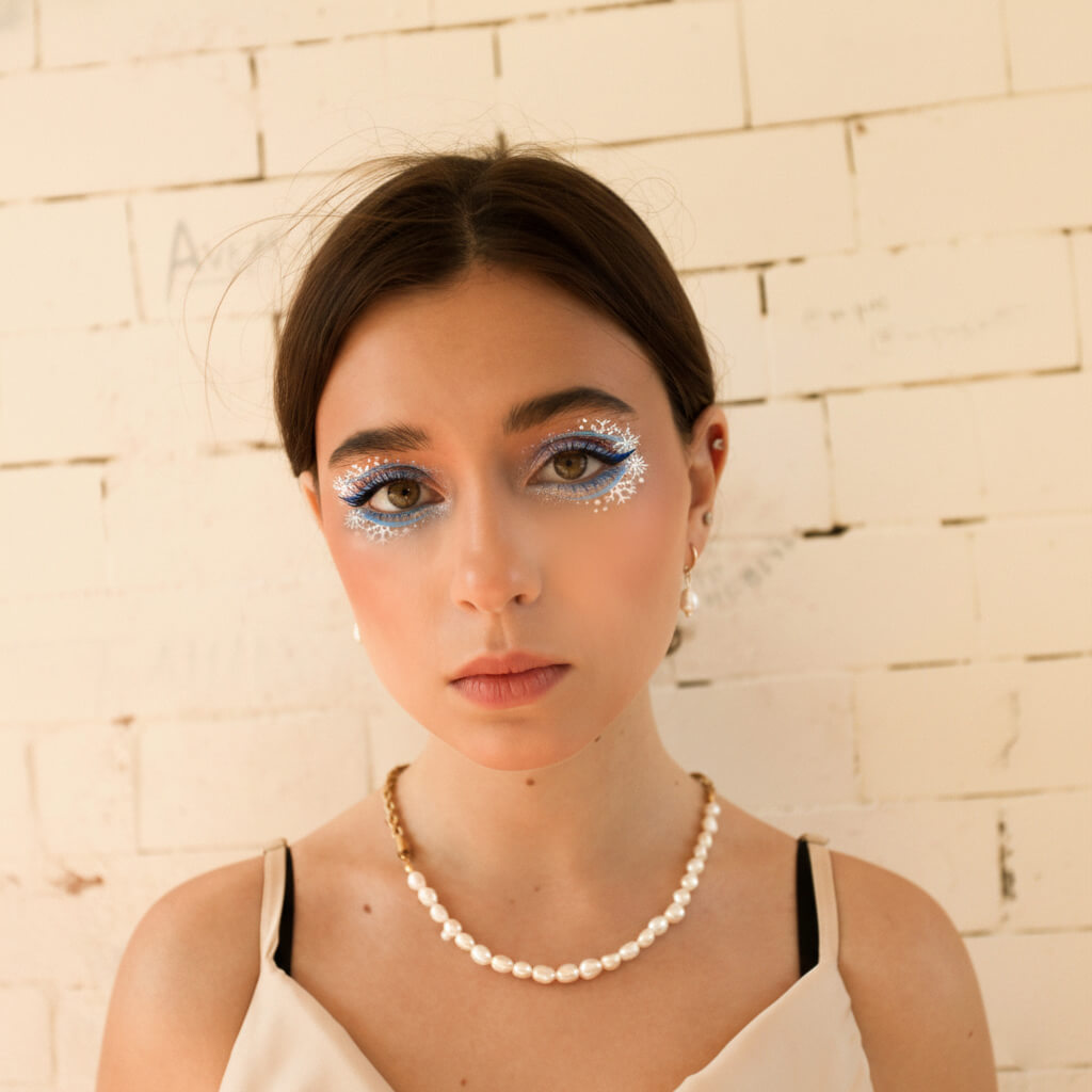 The Ice Princess makeup look highlights bold winged eyeliner, frosty blue and silver eyeshadow, and shimmering rhinestones on the cheeks, creating a magical snowflake effect. It’s completed with a glowing complexion and soft nude lips, embodying an ethereal winter vibe.