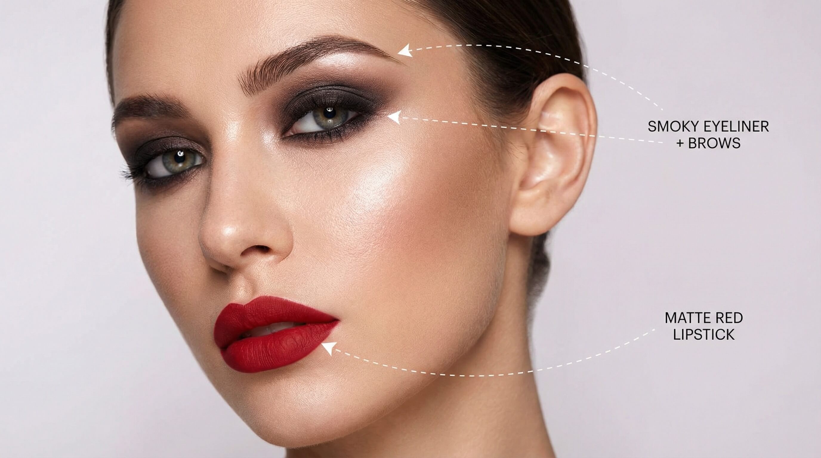 “Editorial glam makeup, smoky eyes, matte red lips, strong highlights, flawless skin texture, cohesive lighting, beauty-focused output.”