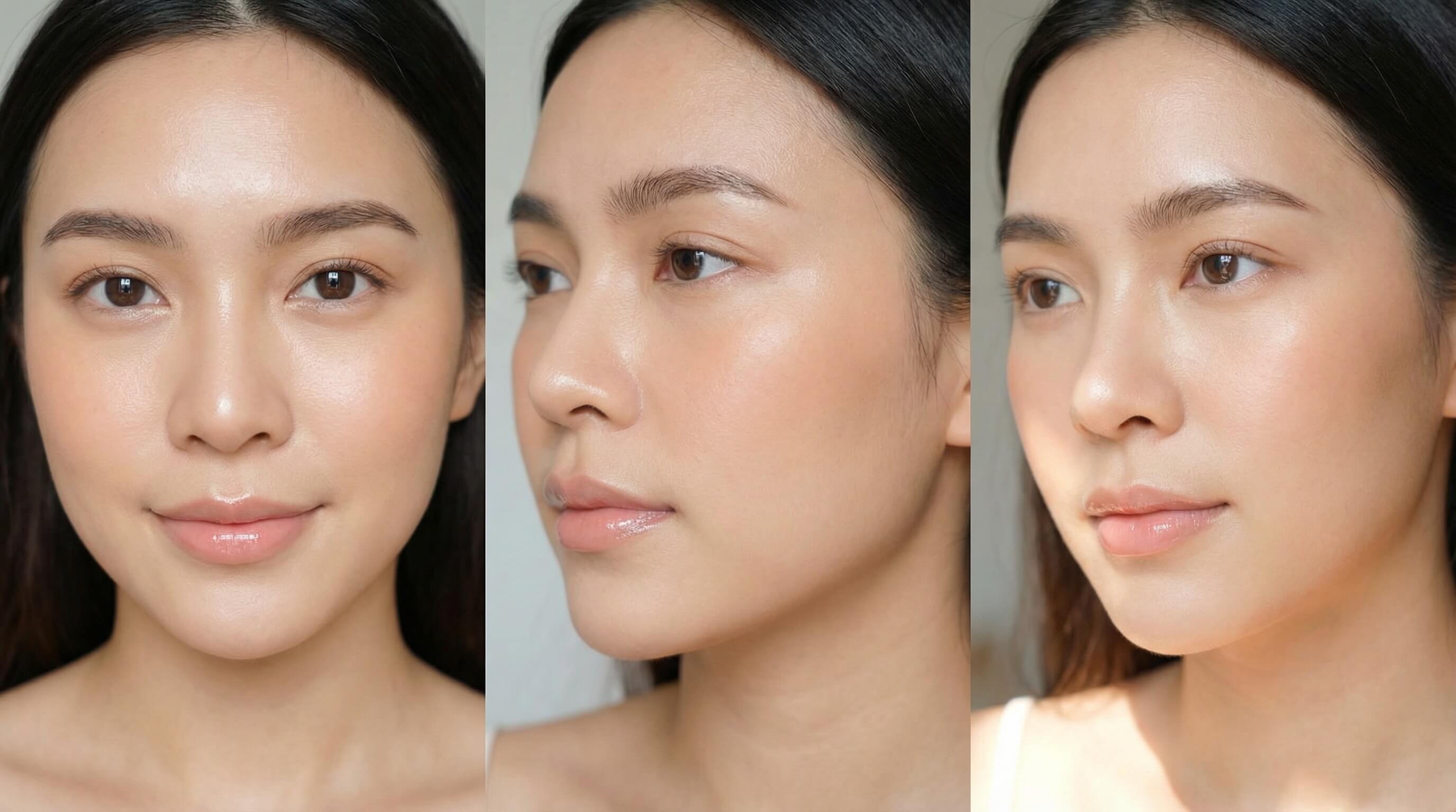 “Natural glow makeup look, soft contour, peach blush, glossy lips, clean brows, even skin tone, photorealistic finish, consistent across three images.”