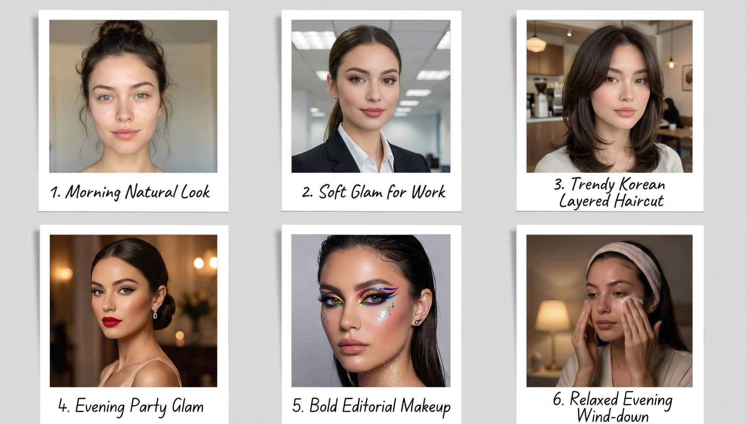 "Generate a 6–8 frame storyboard. Show a cinematic sequence of everyday scenes highlighting different hairstyles and makeup looks: morning natural look, soft glam for work, trendy Korean layered haircut, evening party glam, and bold editorial makeup. Include captions under each frame describing the hairstyle or makeup style. Maintain facial likeness, consistent lighting, and realistic hair and makeup textures throughout the sequence."