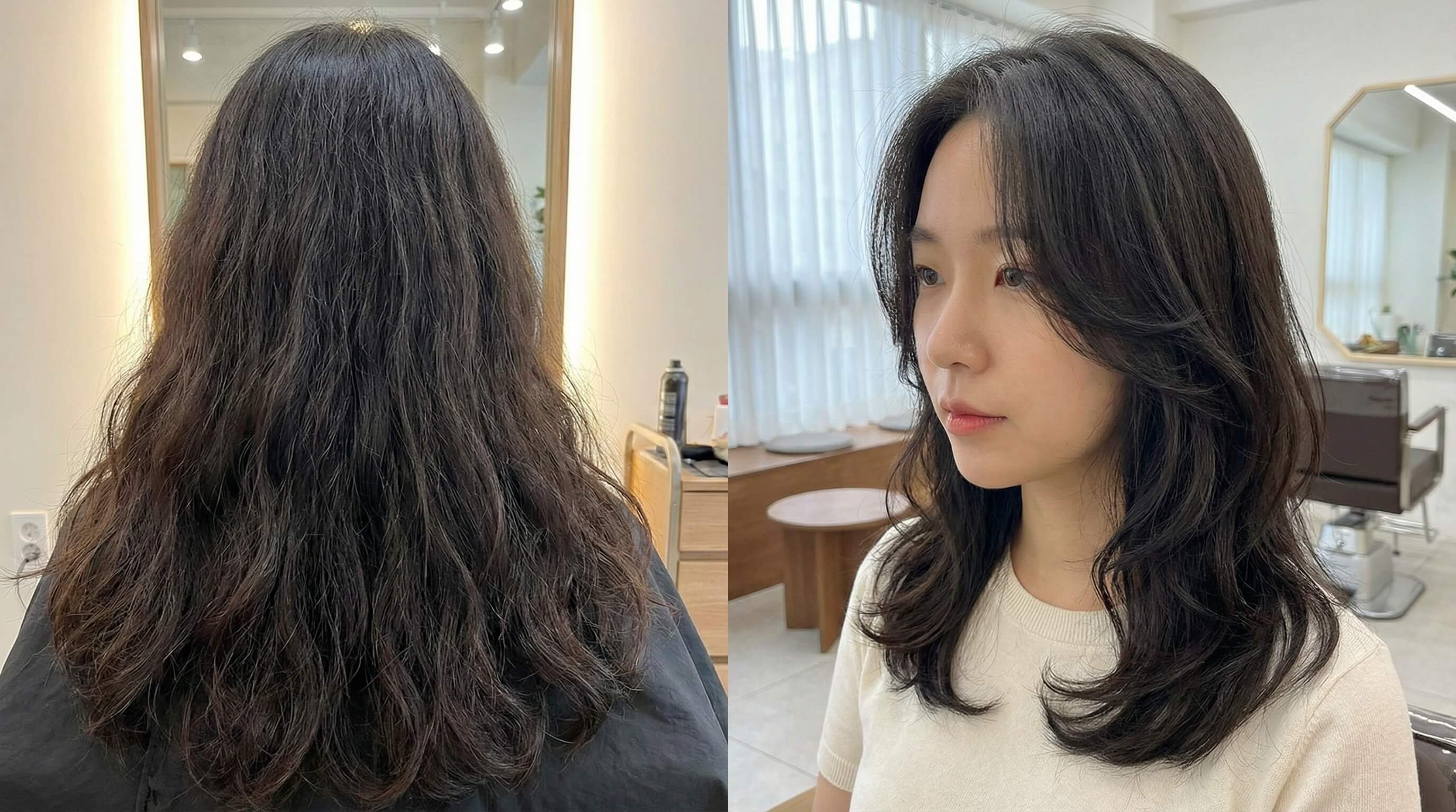“Realistic hairstyle transformation in salon, soft Korean layered haircut, natural volume, smooth hair texture, consistent lighting, matches original face shape.”