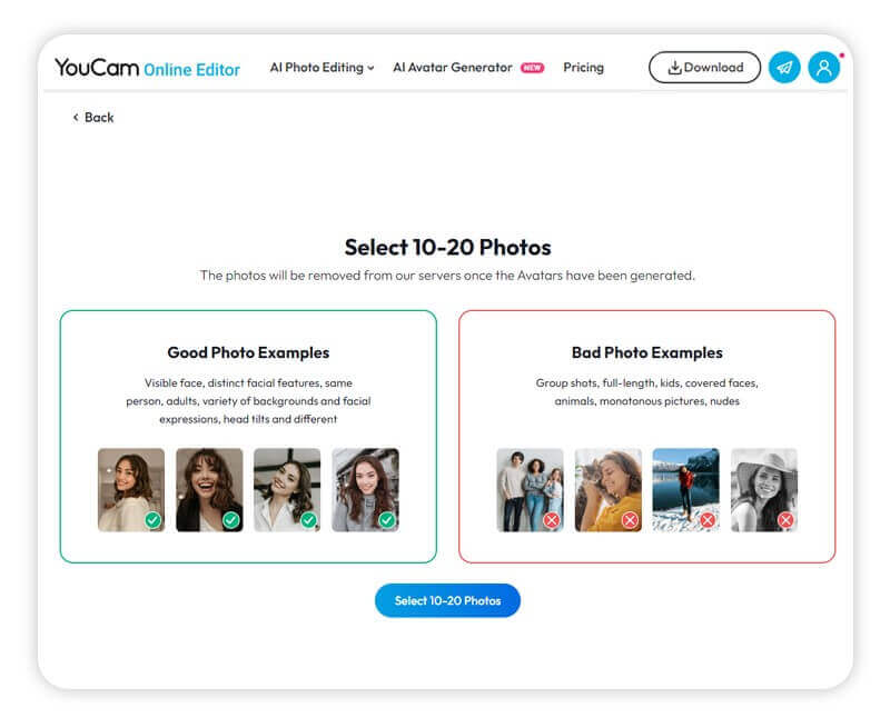Select 10-20 high-quality photos that showcase different angles and expressions of the person you want to create an avatar for. Ensure these photos are clear and well-lit for better results.
