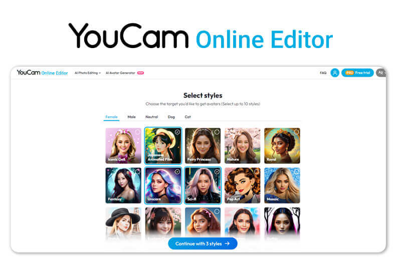 Within the YouCam AI Avatar Generator interface, navigate to the "Start AI Avatar Creation" section, where you'll find various preset avatar styles to choose from. Pick the styles that best matches your preferences or the desired look for your AI avatar.