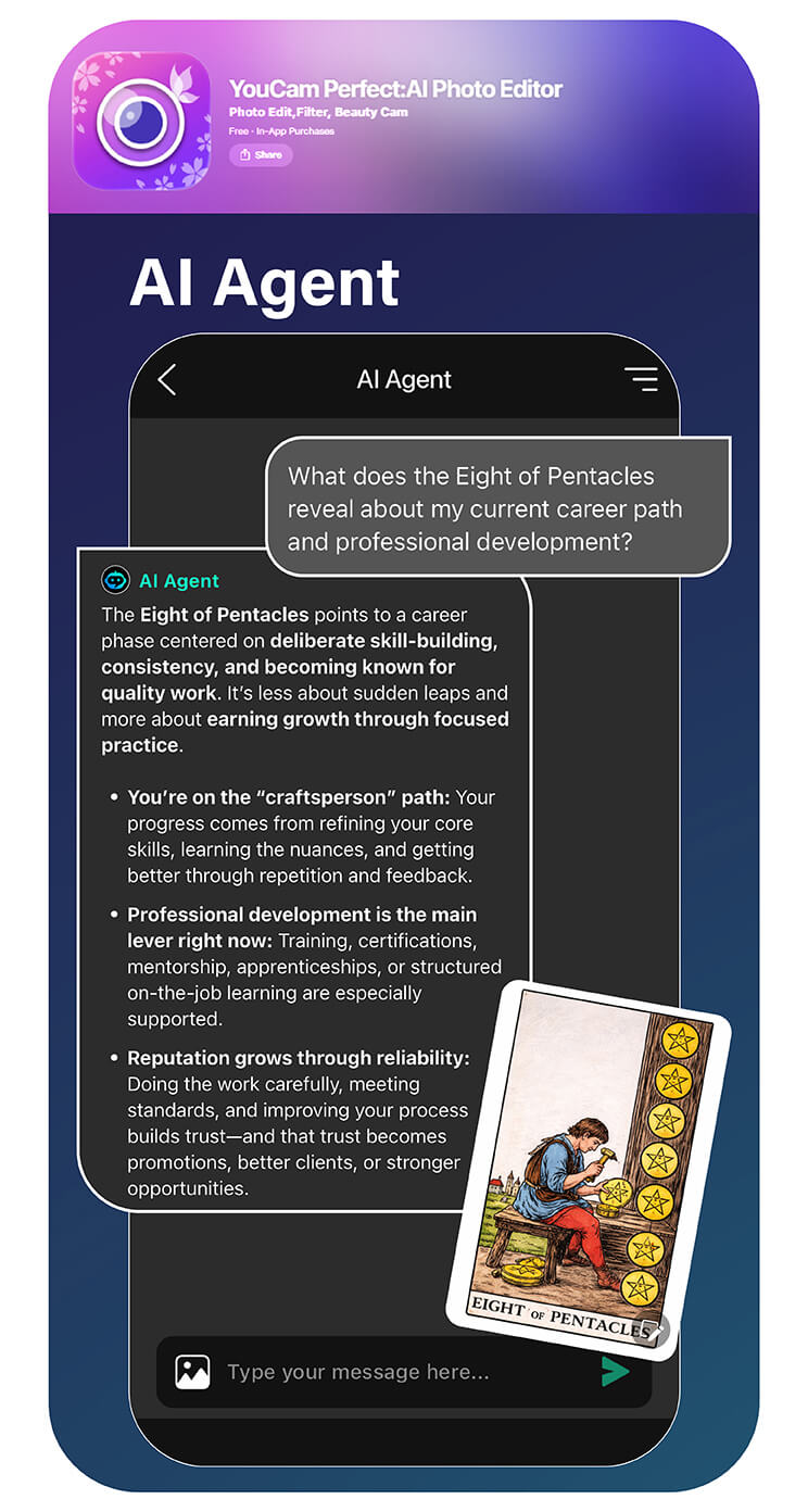 Download YouCam Perfect, open the AI Agent, upload your tarot card image, and start a conversation. Your next insight might already be in the cards. ✨